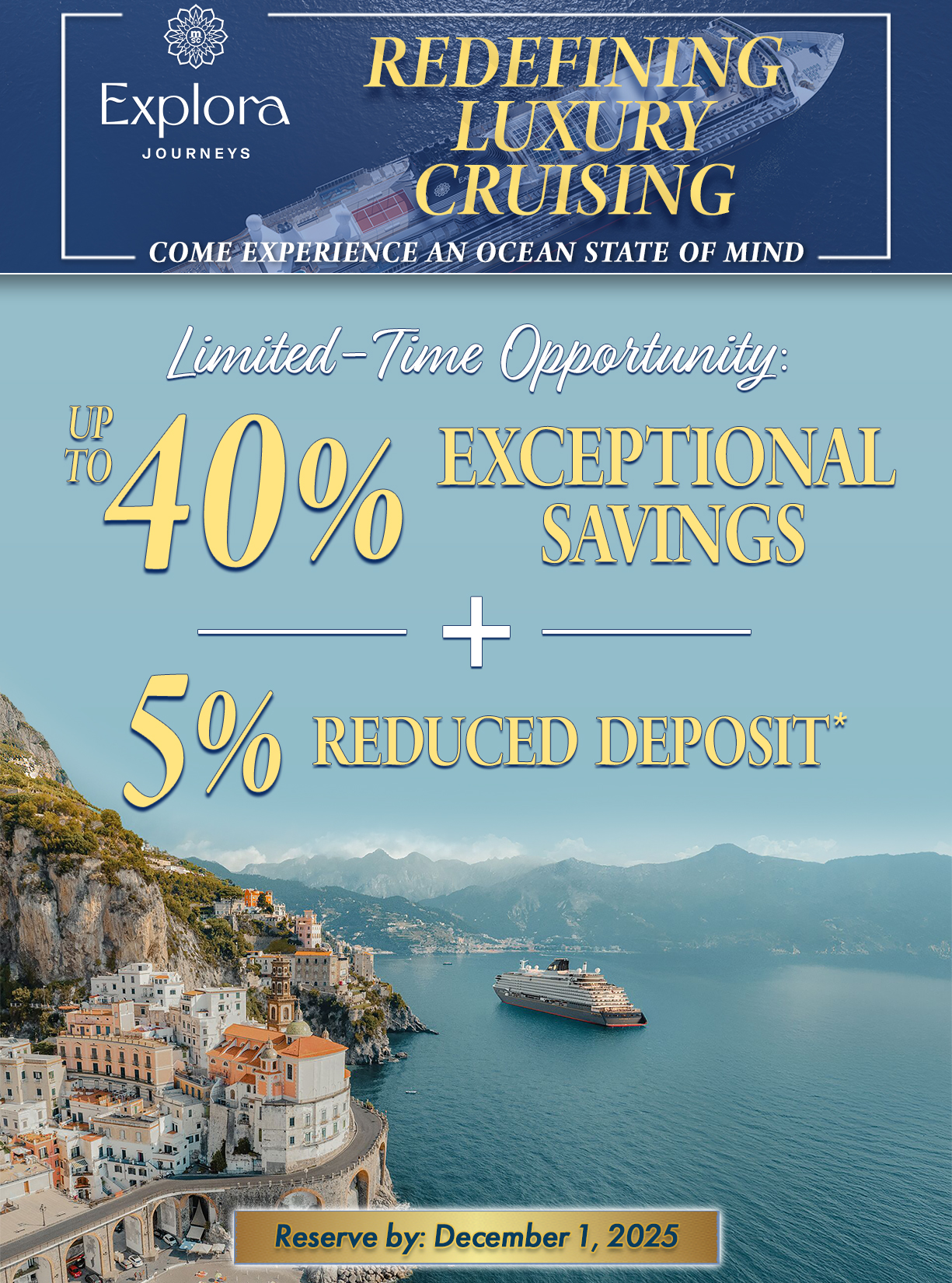 Explora Journeys reserves the right, in its sole discretion, to cancel, terminate, modify, extend or suspend this Promotion at any time without prior notice. Explora Journeys Booking Terms and Conditions, available at https://explorajourneys.com/ or from your Travel Advisor, shall fully apply to all bookings. For any other information, please contact your Travel Advisor or one of our Explora Experience Centre Ambassadors.