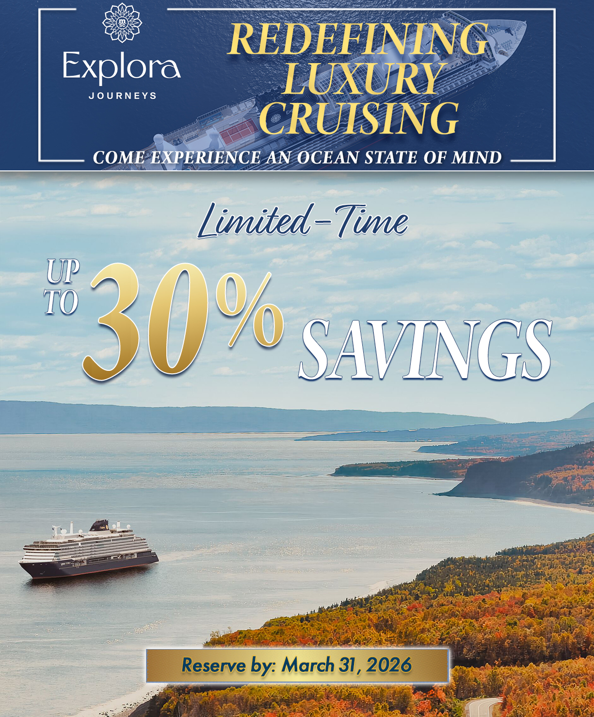 Explora Journeys reserves the right, in its sole discretion, to cancel, terminate, modify, extend or suspend this offer at any time without prior notice. Offer ends March 31, 2026.