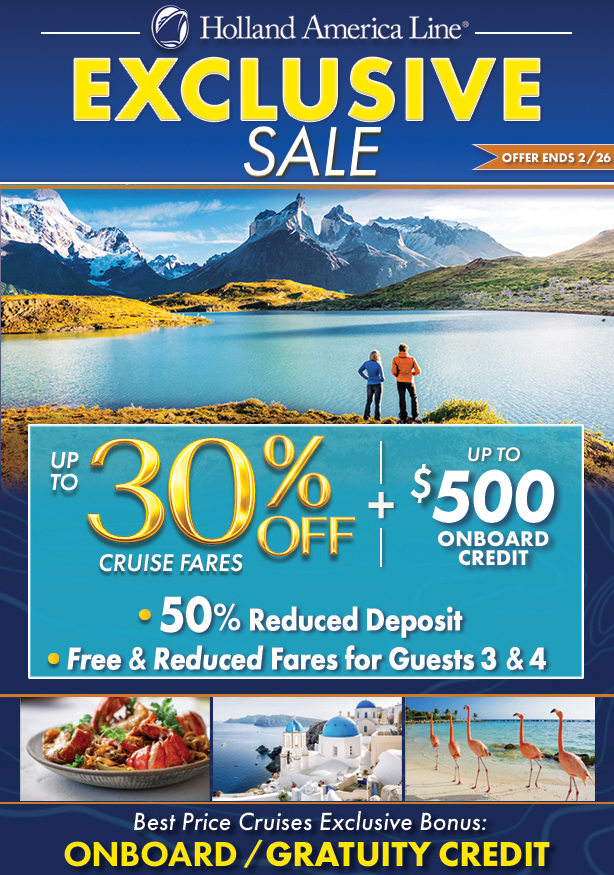 Available only on select Summer 2026–Winter/Spring 2027 cruises and cruisetours and exclude Grand Voyages and any cruise lasting five days or less (“Eligible Cruises”) booked by February 26, 2026 (“Booking Period”). Stateroom upgrades are available in select stateroom categories and ships and subject to the availability of the staterooms in the next highest category. Entire Start Your Journey Sale has no cash value, is subject to availability, is capacity controlled, may be modified or withdrawn at any time, is available for new bookings only, is not combinable with any other discounts, and is neither transferable nor refundable. Fare Discount is based on standard launch fare and excludes Alaska cruisetours. Offer ends February 26, 2026. Free Kids’ Fares: Guests ages 18 and under (“children”) are eligible to travel with free and reduced fares (Taxes & Fees are additional) when booked as a 3rd and/or 4th guest on select 2026 and 2027 cruises. Limit up to two free or reduced fares for children per eligible booking. Kids’ Free or Reduced Fares are available only when booked with promotion code Z3* with a 1st/2nd guest booking with promotion code VV*. Reduced Deposit is a reduced per-person booking deposit available only for 1st/2nd guests in a stateroom on new bookings for select cruises and cruise tours booked outside of the final payment date. Balance is due on final payment of the booking. Offer is available only on select cruises and cruise tours unless sold out or otherwise withdrawn. Standard refund and cancellation conditions apply. A deposit is required for all stateroom guests and the amount of deposit varies, even if deposit is reduced per Offer. Onboard Credit is available in the following amounts: US$100 per person (US$200 per stateroom) for guests booked on a 6- to 9-day cruise; US$150 per person (US$300 per stateroom) for guests booked on an Alaska cruisetour or 10- to 20-day cruise; US$200 per person (US$400 per stateroom) for guests booked on a 21+ day cruise; and US$250 per person (US$500 per stateroom) for guests booked on a Legendary Voyage. Limit: One (1) Onboard Credit per guest. Onboard Credit is in USD, is neither refundable nor transferable, and has no cash value. Onboard Credit expires at the end of the Eligible Cruise and may not be used in the Casino or on any other specified fees or items. Onboard Credit offer ends February 26, 2026. Ships’ Registry: The Netherlands
