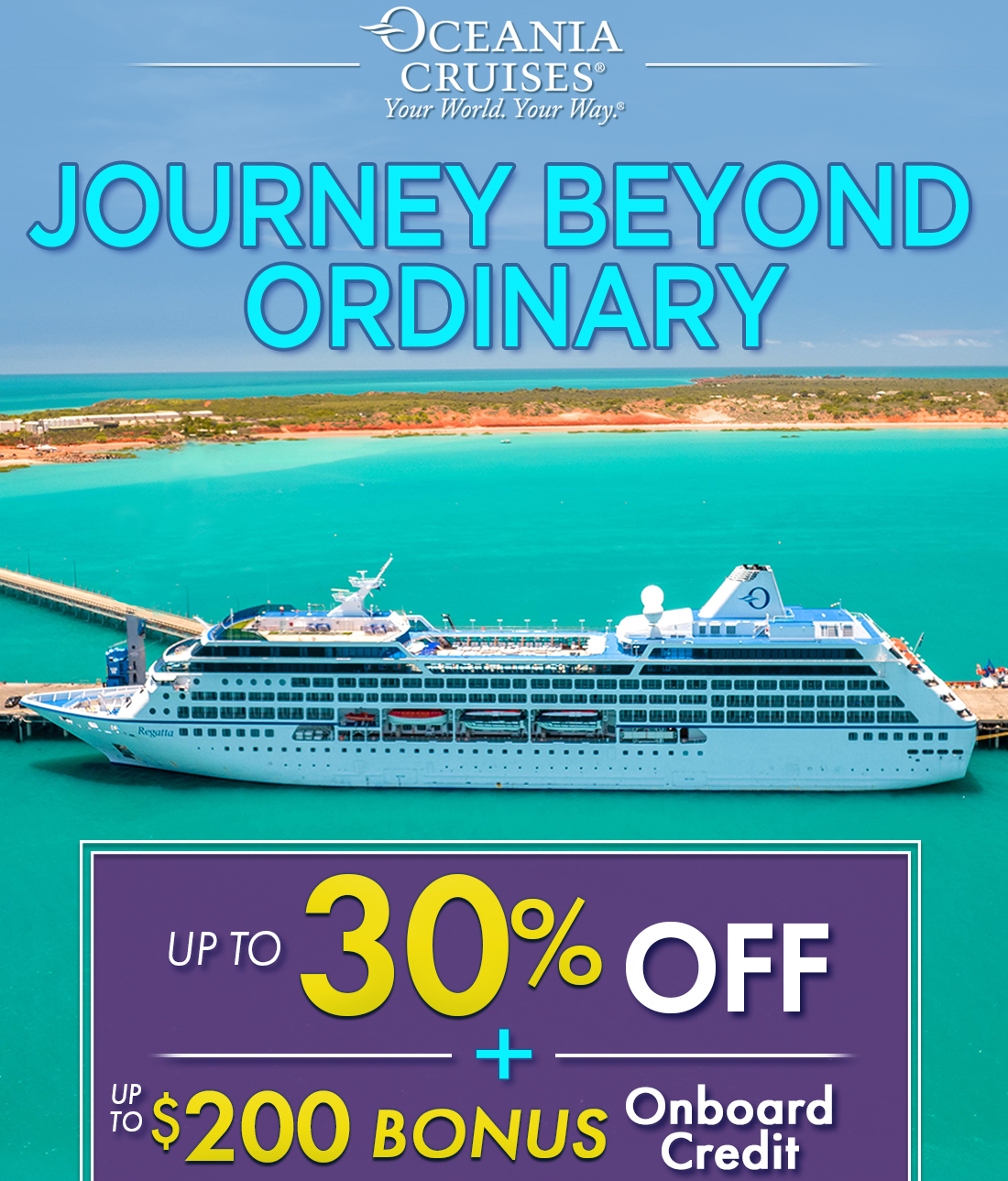 Offer valid for a limited time only. Up to 30% Off Cruise Fares is based on select voyages listed, subject to change, and already reflected in displayed price. Offer is combinable with Your World Included™ amenities. No additional discount or amenity will apply. Offer is subject to change or removal without prior notice. Offer is valid for new bookings only; cancellations and rebooks are exempt from this offer. Offer is nonrefundable and non-transferable. Offer amounts are quoted in USD unless explicitly noted otherwise.