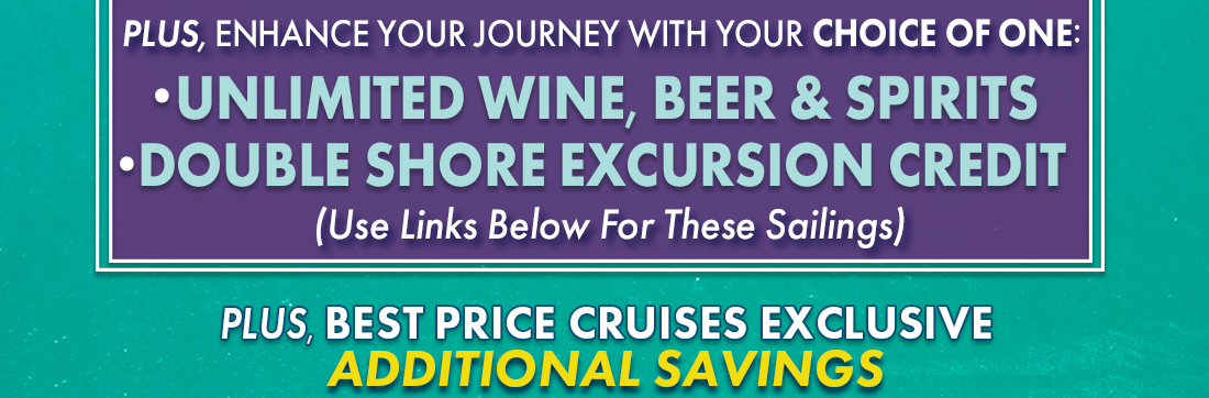 Offer valid for a limited time only. Double Shore Excursion Credit or Prestige Beverage Package offer is based on select voyages listed, subject to change, and is already reflected in displayed price. Offer is combinable with Your World Included™ amenities. No additional discount or amenity will apply. Please choose your offer selection in the OPTIONAL ADD-ONS section when booking, or reach out to your travel advisor/agency to select your choice of Double Shore Excursion Credit or Prestige Beverage Package. Offer is subject to change or removal without prior notice. Offer is valid for new bookings only; cancellations and rebooks are exempt from this offer. Offer is nonrefundable and non-transferable. Offer amounts are quoted in USD unless explicitly noted otherwise.