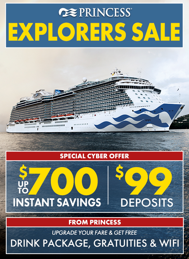 Available to legal residents of North America, 21+. Offers only available on select cruises, on a limited availability, are capacity controlled (regardless of stateroom availability), and may not be combined with other offers or promotions (aside from those listed herein). Other exclusions may apply; void where prohibited. Changes or refunds may not be permitted. Offers and their parts (if any) are not transferable, not substitutable, and not redeemable for cash. Princess Cruise Lines, Ltd. (“PCL”) is not responsible or liable for any errors, including printing or other errors. PCL may change or revoke Offers at any time. A non-refundable deposit is required for all stateroom guests. Deposit amount may vary. All values quoted in USD.