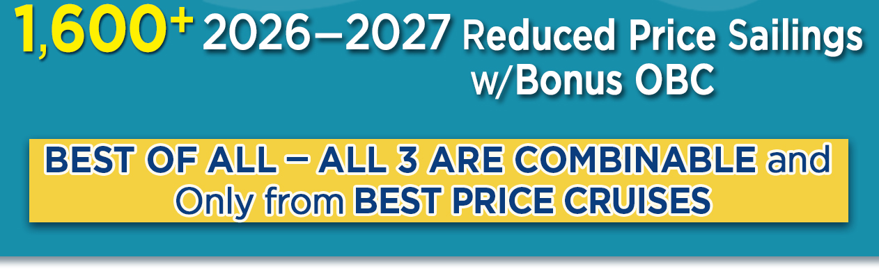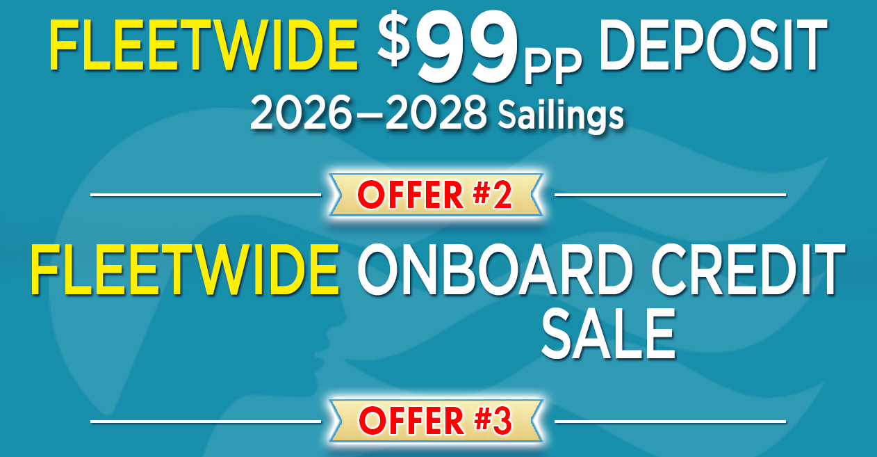 Prices listed are Cruise Only, per person, based on double occupancy and include port charges & taxes. Onboard and/or gratuity credit is based on category and cost. Fares based on Internet booking by the consumer, call-in pricing and booking by a Cruise Specialist in some cases may be slightly higher. Gov't taxes & fees are included. All prices are in US$ and airfare is additional unless otherwise noted. Limited availability may apply, and prices are subject to change without prior notice. Dollar and Percentage off coupons/letters/codes may be restricted and could lower onboard credit associated with these specials. Restrictions may apply to other discounts/upgrades. Typographical errors may occur.