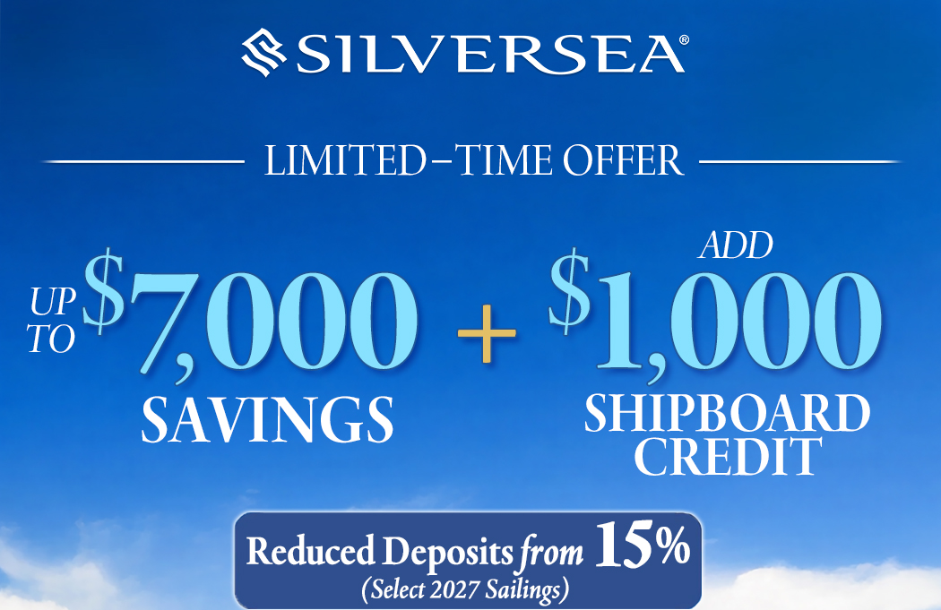Indulgent Savings Offer and Shipboard Credit Offers are combinable with each other, Event Certificates, National Account Amenities, Referral Savings, Onboard Savings, Combination Savings (back-to-back), Kids Savings and Venetian Society Savings. Offers are not combinable with Last Minute fares. Shipboard Credit Offer is not combinable with promotional group fares. Cancel and re-books do not qualify. Single occupancy guests paying 200% cruise fare are eligible for full offer; single occupancy guests paying less than 200% cruise fare are eligible for a prorated amount of the offer. Changes to the booking may result in the removal of the offer. Prices and offers are capacity controlled, subject to availability, and can be removed at any time without prior notice. Silversea reserves the right to correct any errors, inaccuracies, or omissions and to change or update fares, fees, and surcharges at any time without prior notice. Other restrictions may apply, visit Silversea.com. ©2026 Silversea Cruises LLC. Ships’ registry: Bahamas and Ecuador.