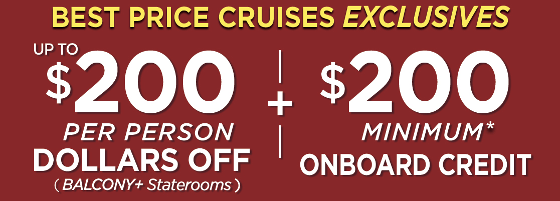 Prices listed are Cruise Only, per person, based on double occupancy and include port charges & taxes. Onboard and/or gratuity credit is based on category and cost. Fares based on Internet booking by the consumer, call-in pricing and booking by a Cruise Specialist in some cases may be slightly higher. Gov't taxes & fees are included. All prices are in US$ and airfare is additional unless otherwise noted. Limited availability may apply, and prices are subject to change without prior notice. Dollar and Percentage off coupons/letters/codes may be restricted and could lower onboard credit associated with these specials. Restrictions may apply to other discounts/upgrades. Typographical errors may occur.